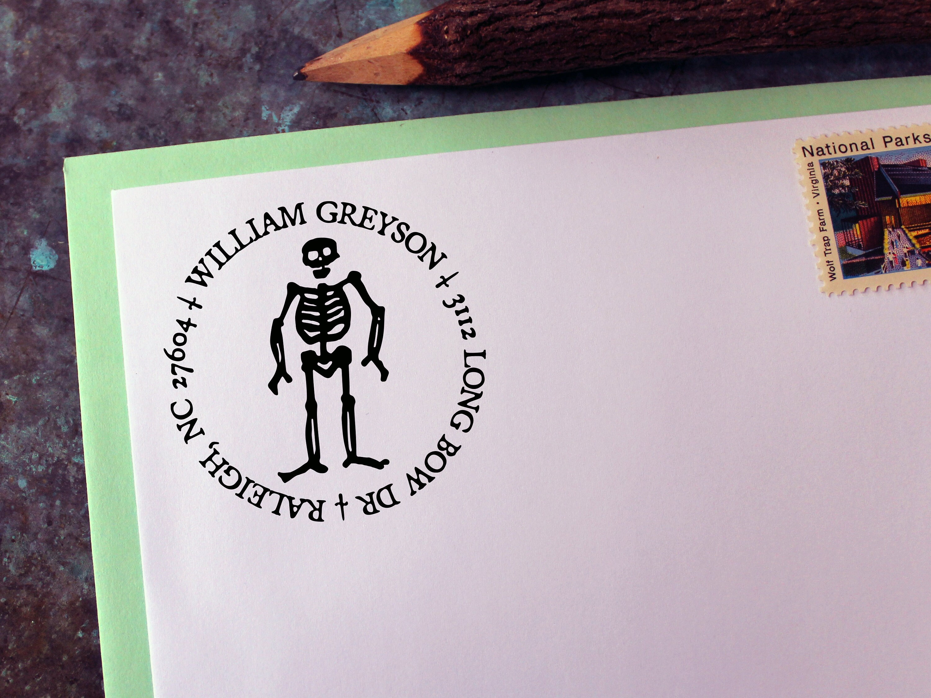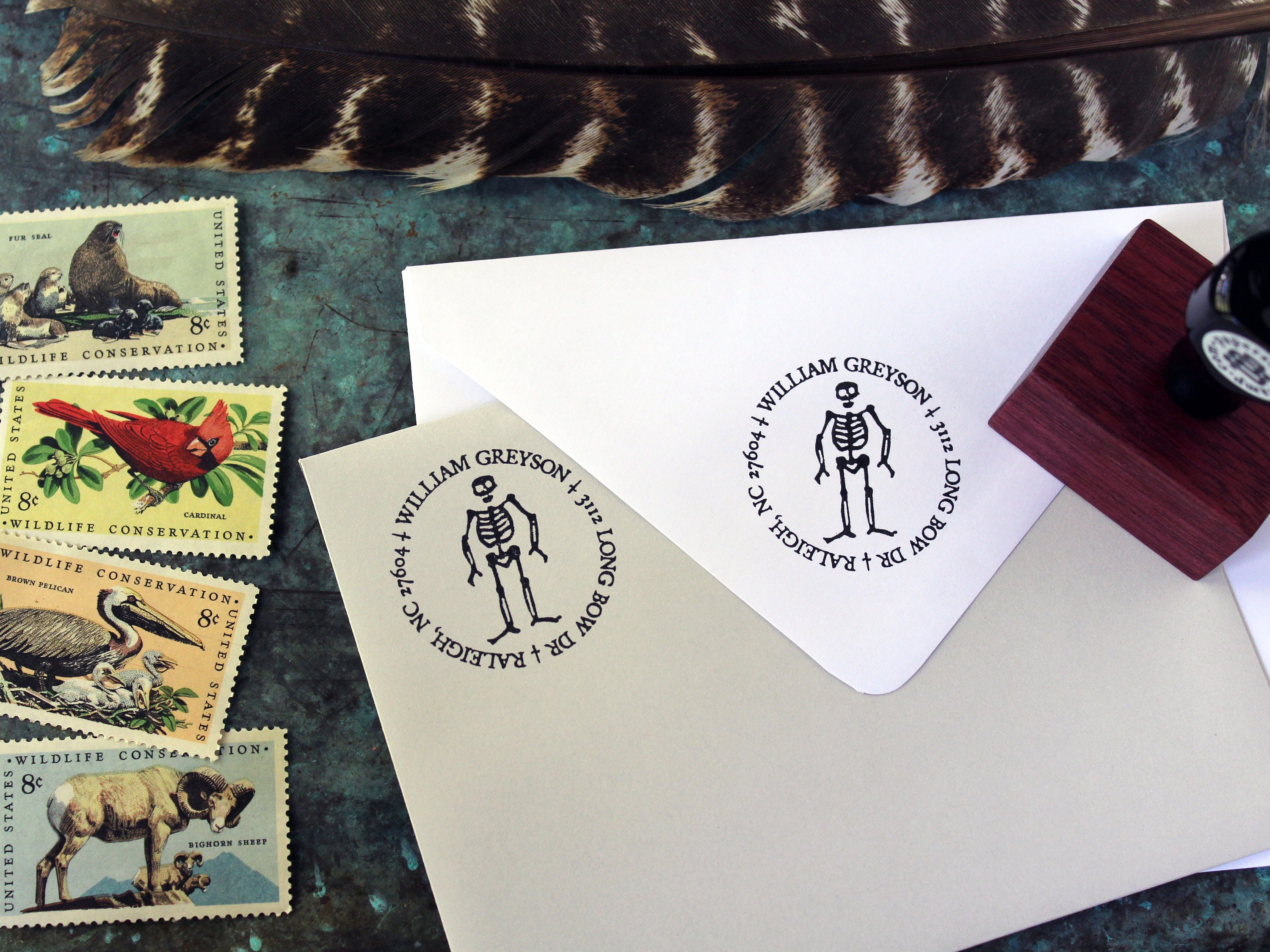 These return address stamps feature some of the most famous symbols used on pirate flags from the Golden Age of Piracy in the 17th-18th century. This particular design features the pirate flag used by Edward "Ned" Low.