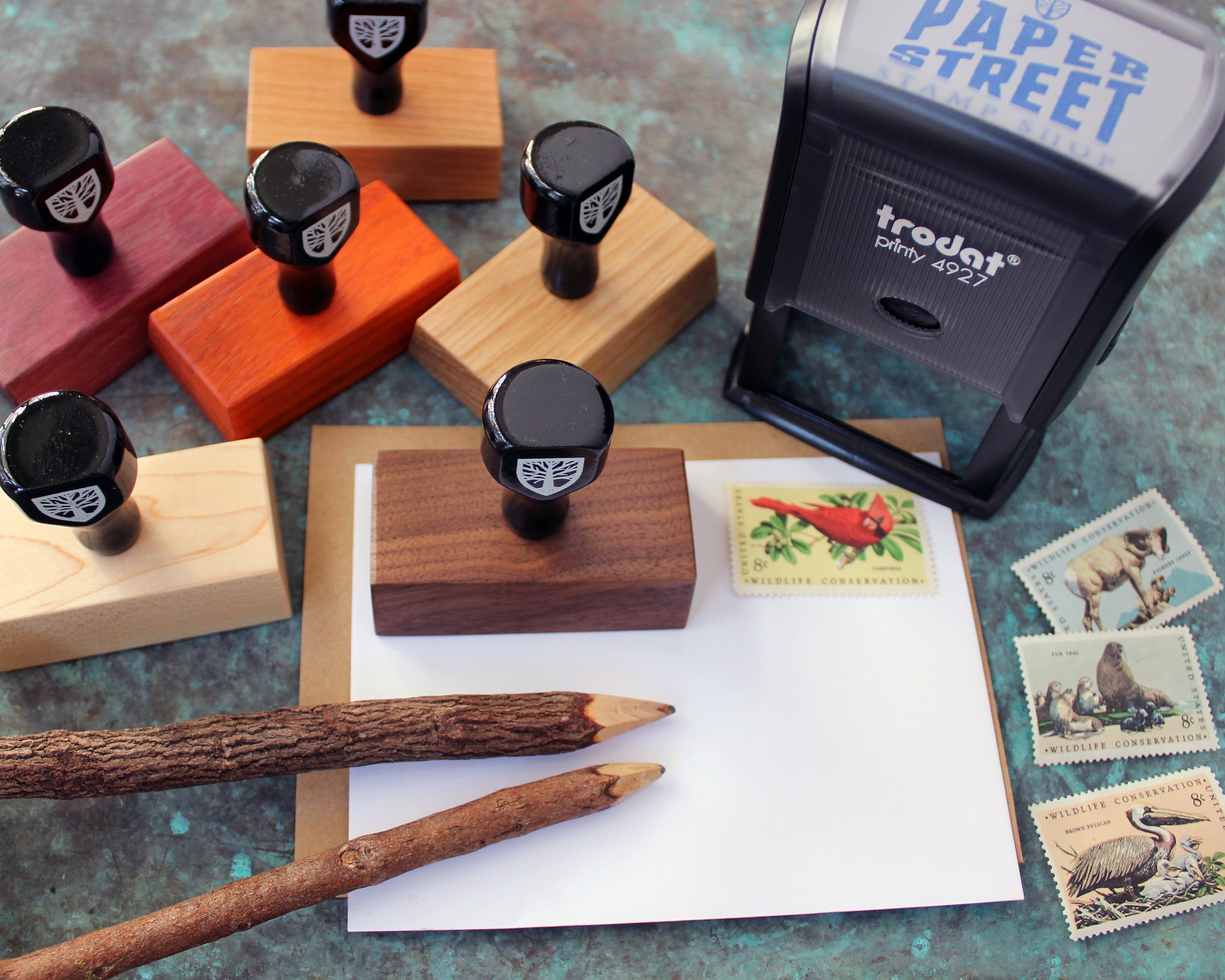 In an electronic world, there’s something special and tangible about paper stationary and invitations. Our "save the date" stamps are perfect for personalizing wedding invitations, RSVPs, “Save the Dates”, holiday cards, party invitations, letters, packages, etc. Whether you choose a premium hardwood stamp handcrafted in maple, cherry, or walnut, or prefer the convenience of an eco-friendly self-inking stamp, we can personalize a rubber stamp for you. Every aspect of your stamp is produced in-house at Paper Street Stamp Shop. I’m a graphic designer and a woodworker, and this translates to me being completely in control of the quality and speed in which you receive your personalized stamp.