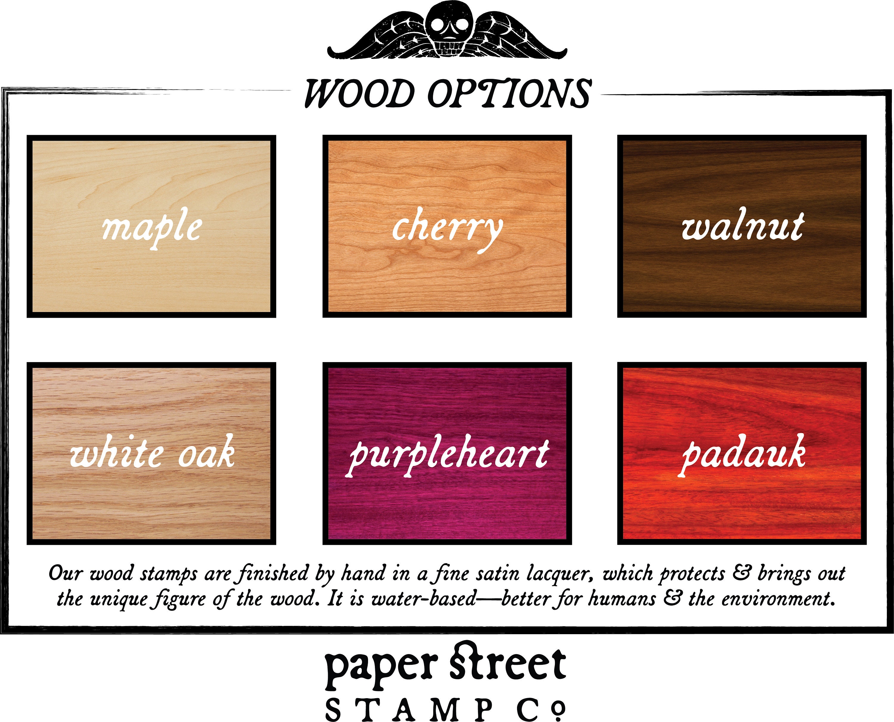 -Wood stamps are handcrafted and finished in lacquer to protect the surface and bring out the figure and natural character of the wood.